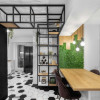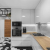 • Zonă bar între bucătărie și dining, cu blat tip bar, structură metalică, spații de depozitare și 4 scaune